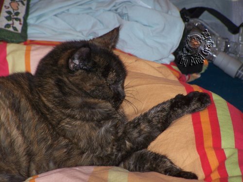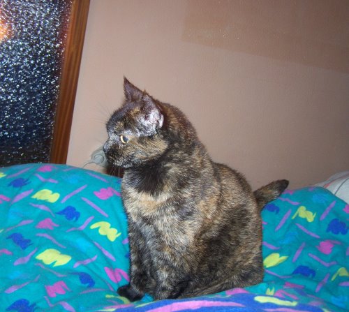 Sie schläft mit auf dem Bett, allerdings nur kurze Zeit, dann verzieht sie sich ins Wohnzimmer - entweder unter die Heizung oder in ihre Höhle im Kratzbaum.