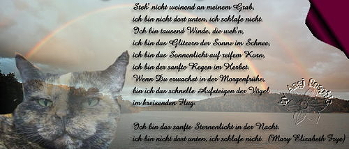 Wie du siehst kleine Cleo - unser Leben ging weiter. Wir haben uns mit der neuen Situation arrangiert und leben nun unser Leben ohne dich, aber in meinen Gedanken bin ich sehr oft bei dir mein Mädel. Und oft fließen dann auch noch Tränen.
