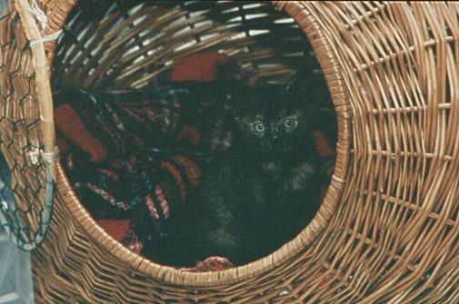 Die Fahrt nach Hause dauerte eine Weile und dann war es soweit. Ich stellte den Korb ins Wohnzimmer, und Dyssi kam an. Er dachte wohl, daß ich unseren geliebten Cäsar zurückgebracht hatte. Als er dann aber euch kleine Minikatzen dort drin sitzen sah, fing er an, fürchterlich zu knurren und zu fauchen.